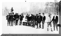 ![]() A funeral party of men and a small girl somberly gathers around a casket strapped to a toboggan on a snowy field near the town of Hahn's Peak (also known as Poverty bar), Colorado, in Routt County. Two dogs stand near the group of people; the men wear dark suits, boots, and hats. |