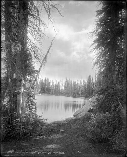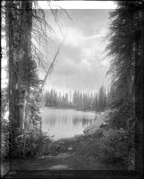 ![]() Tall pine trees frame view of George Lake near Buffalo Pass (on Continental Divide, border of Routt and Jackson Counties, Colorado). |