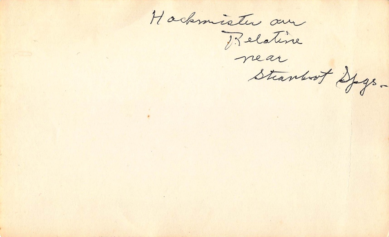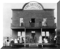 ![]() People pose at The Antlers, in Yampa, Routt County, Colorado, a frame hotel with porch/balcony and sign: "The Antlers. "The group are (upper deck): 1. Myrtie Bird Trantham, 2. Levi Trantham, 3. Minnie Lindsey, 4. Addie Hunter; (lower level, l to r): 5. Ida Bird, 6. Annie Butteric, 7. Harry Butteric, 7x. Auntie Hopper, 8. Alice Bird, 9. leash (?) Cottonting, 10. Lem Lindsey, 11. Auntie Lindsey, 12. J. P. Lindsey, 13. Emma Bryant, 14. Maud Trantham, 15. Dan Trantham, 16. Gus Bower, 17. Etta Phillips." "Taken 1899" |