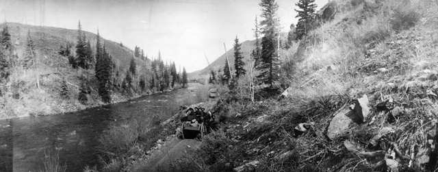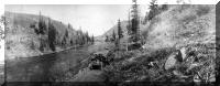 ![]() Four men, who look behind them, travel in a horse-drawn cart down a rocky road that parallels Elk River near the town of Hahn's Peak (also known as Poverty Bar), Colorado, in Routt County. |