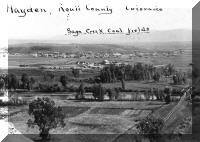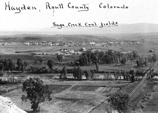 ![]() View overlooking the agricultural community of Hayden, Colorado, in Routt County. An iron bridge crosses the Yampa River. Haystacks dot the field next to the town. |