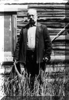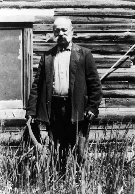 ![]() Joe Moran poses in the tall grass for a full-torso portrait in front of a wood-frame building in the town of Hahn's Peak (also known as Poverty Bar), Colorado, in Routt County. |
