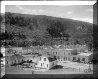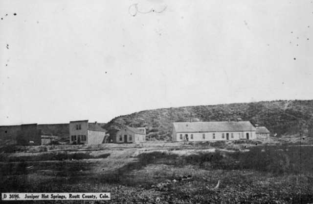 ![]() Panoramic view of the small community of Juniper Hot Springs, Colorado, in Routt County shows one and two-story commercial storefronts with gables and false fronts, a residence, and a boarding house on the street. Two men stand in front of the open door of the boarding house. |