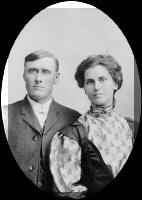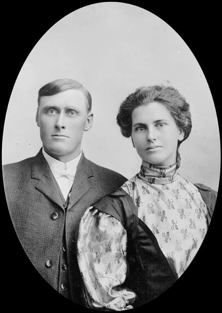 ![]() Head and shoulders portrait of Benny and Percy Laughlin, Yampa, Routt County, Colorado. Benny wears a suit and white bow tie; Percy has on a brocade blouse with high neck and puffed sleeves. |