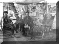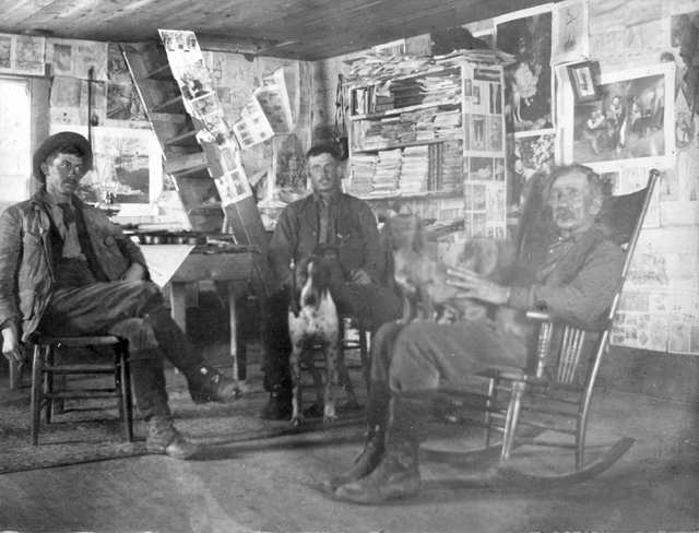 ![]() Miners pose indoors with dogs in Routt County, Colorado. Newspaper clippings and posters cover the walls. |