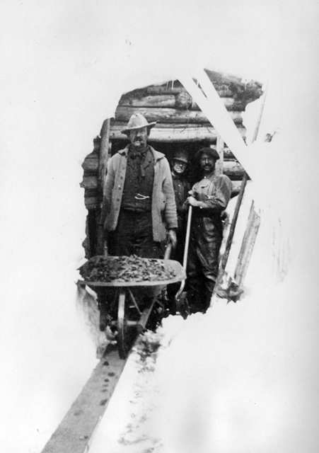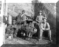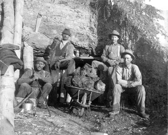 ![]() Four miners pose with a wheelbarrow full of ore, Routt County, Colorado. The hillside behind them has been cut away. |