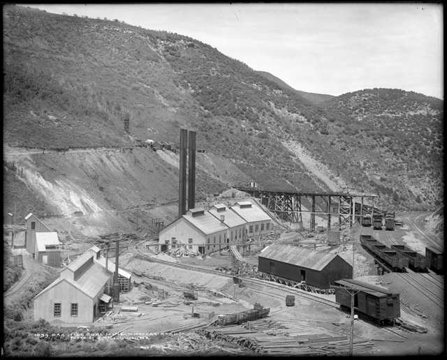 ![]() Oak Creek (or Hill) Coal Mine, Colorado (Routt county), reached via Moffat Road, Denver and Salt Lake Railroad (formerly Denver, Northwestern and Pacific); shows coal mine, smelter, coal carts and tracks, standard gauge track and sidings with hopper and box cars, photo by L.C. McClure, Denver. |