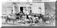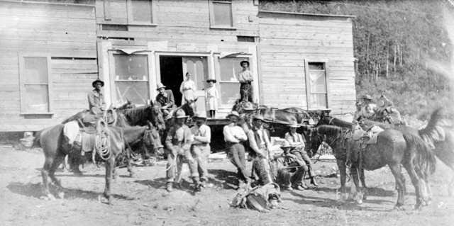 ![]() Men, women, and children pose with saddled horses in front of the wood frame store, Clark, Routt County, Colorado; sign above door reads: "Express Room." |