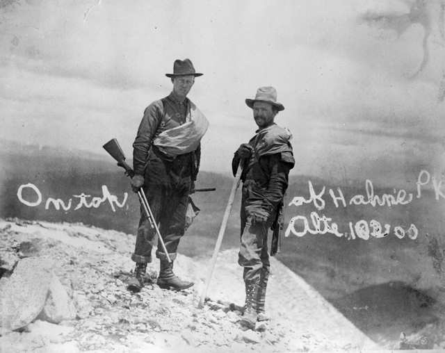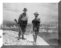![]() Two prospectors, W. A. George and Sam Stevens, stand on a promontory near Hahn's Peak (also known as Poverty Bar), Colorado, in Routt County. George, who was killed in a mining accident in 1905, holds a rifle in his right hand and a pack in his left hand. Stevens holds a long, wooden pole in his right hand. Each man has a canvas pack draped across his chest and wears long-sleeved shirts, trousers, long, leather boots, and cowboy hats. |