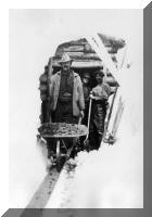 ![]() Pete Pourtalis pushes a wheelbarrow full of ore out of a mine near the mining community of Hahn's Peak (also known as Poverty Bar), Colorado, in Routt County. He wears a jacket, a long-sleeved shirt, trousers, and a cowboy hat. He holds a pipe in his mouth. Two miners stand behind him under the timbers of the mine shaft. |