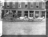 ![]() Men and a woman pose on a horse-drawn stagecoach in Routt County, Colorado. Women and girls sit in the windows of a nearby building. |
