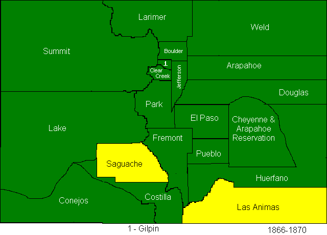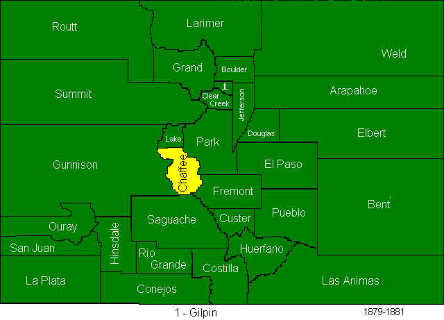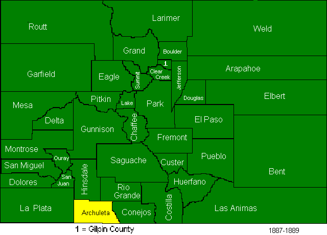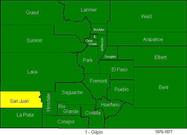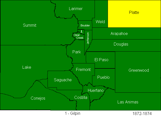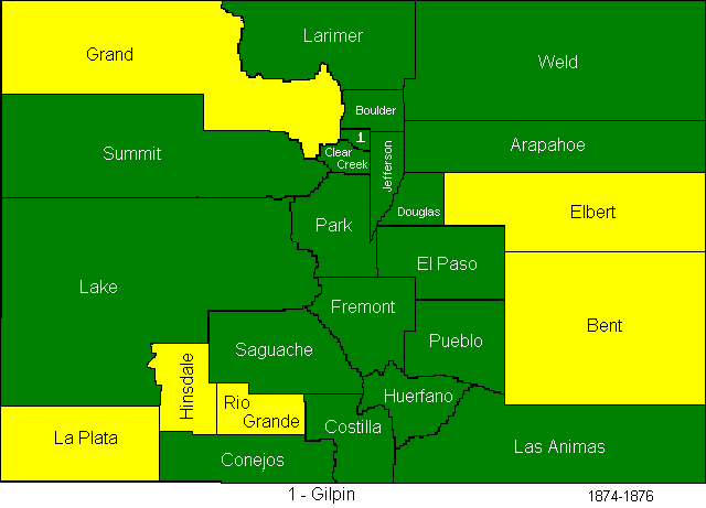 In 1874, Greenwood and Platte Counties were abolished, Bent, La Plata, Hinsdale, Rio Grande, Elbert, and Grand Counties were created. (Bent County is often reported to have been created in 1870, but this page creator believes that those reports are using the date of the creation of the now defunct Greenwood County as the date of the creation of the successor county.)