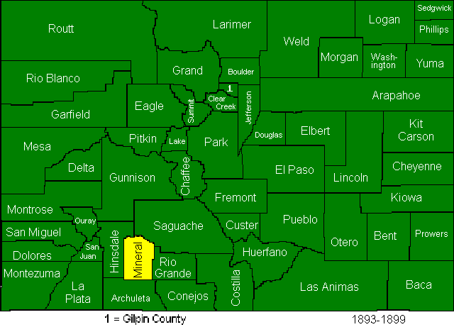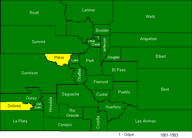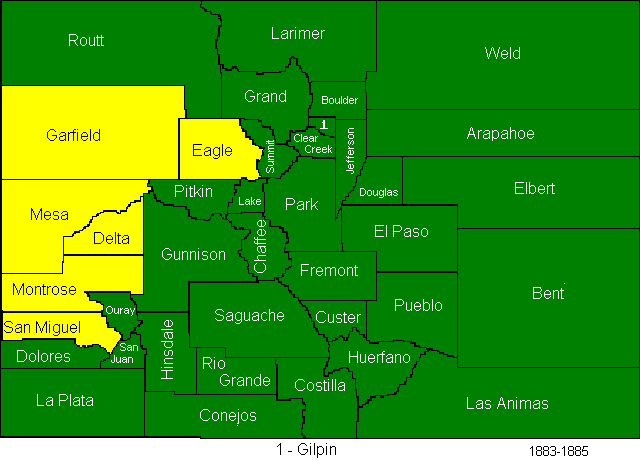 In 1883, Garfield, Eagle, Mesa, Delta, Montrose, and San Miguel Counties were created.