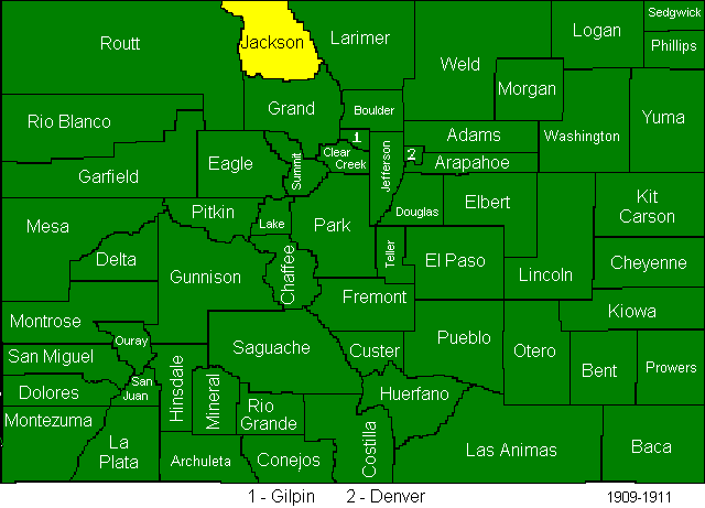 The Arapahoe county split created Denver and Adams Counties, and sent parts of what had been Arapahoe County to Washington and Yuma Counties. Due to some legal wrangling some of the final results of this act were not officially in place until 1906.