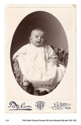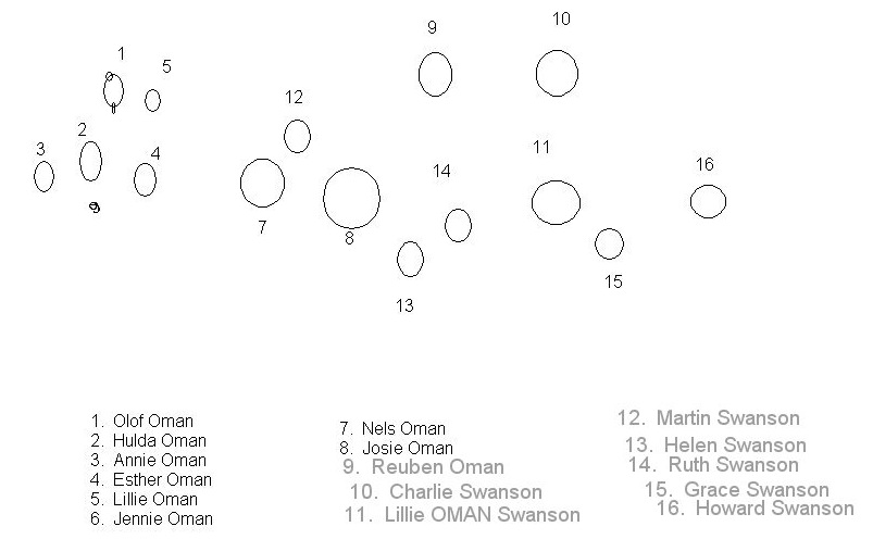 This above photo is Lillie OMAN Swanson and her sisters in law, sent to her aunt in Sweden. Mrs Anie Swanson is Anna A. Tureen, b. 1887 Nebraska, d Apr 1968, married to Victor Emanuel Swanson, b Dec 27, 1886, d Apr 4, 1946. Mrs. Oscar Swanson would be Hilma Sophia Kristina, b Sept 5, 1885, d Dec 5, 1968 who was married to Oscar Edward Swanson, b Apr 9, 1885, d Oct 11, 1929.