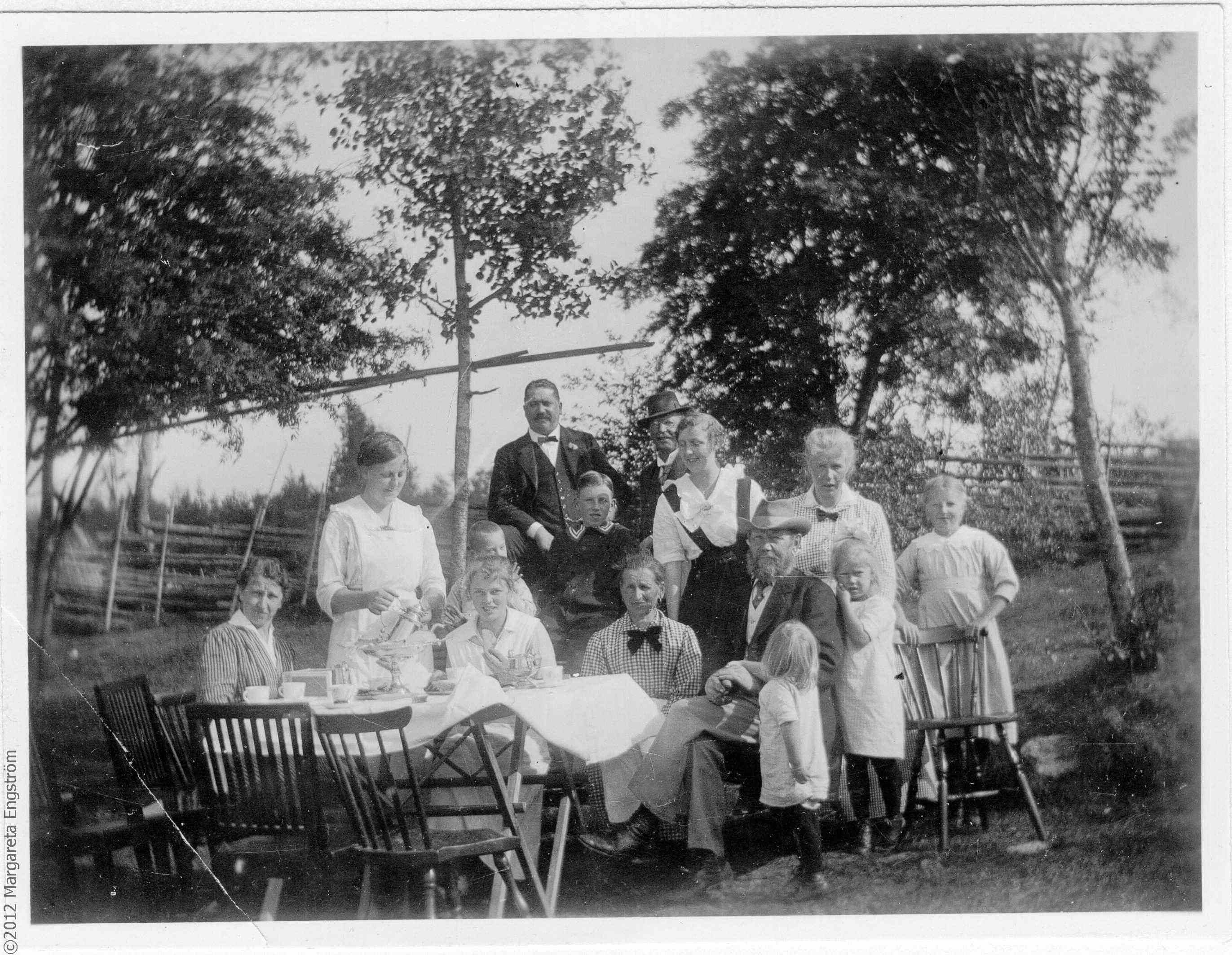 Nels made a trip to Sweden in 1900 It's very likely that he's the one seated with the hat. Margareta wrote with the photograph "The little girl putting her hand on his, is my mothers sister Anna, and the girl standing near is my mother Sigrid, and behind her mother Anna, my Granma."