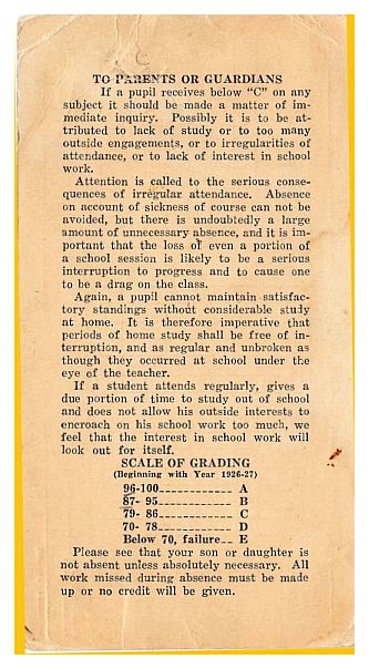 Report Card from 1926-1927 for Madge Maynard. Her father, John Maynard, was the president of the High Prairie School Board in 1929.