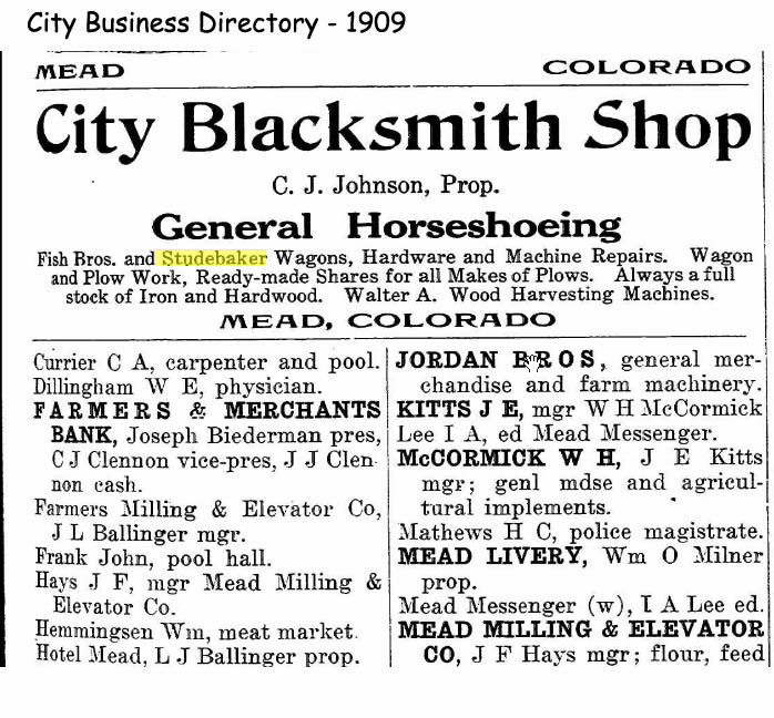 The Town of Mead, Weld County Colorado, was originally founded in 1906 when the Great Western Railroad announced they were bypassing the growing community of Highlandlake, (founded in 1871-72), and instead laying track a full mile east of the town. Additionally, the promised beet dump was now to be located on the eastern border of Paul Mead's (nephew of Highlandlake founder, L. C. Mead) farm.