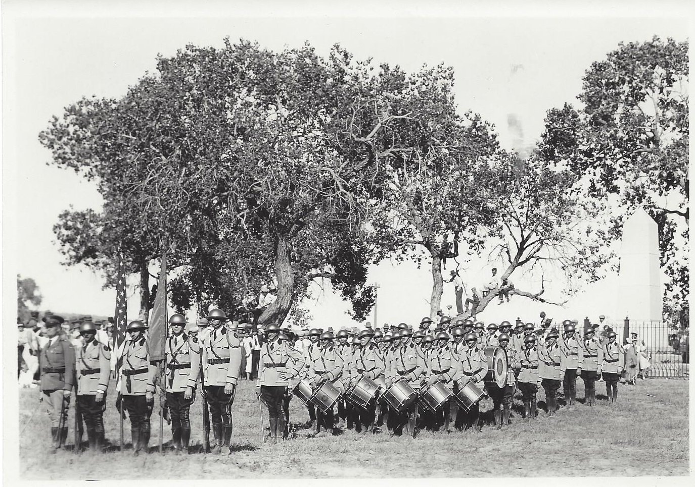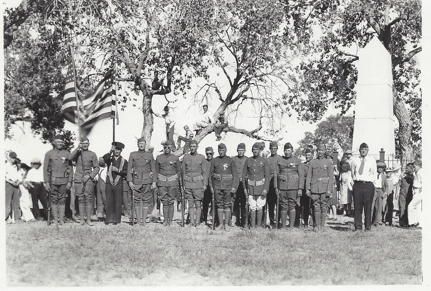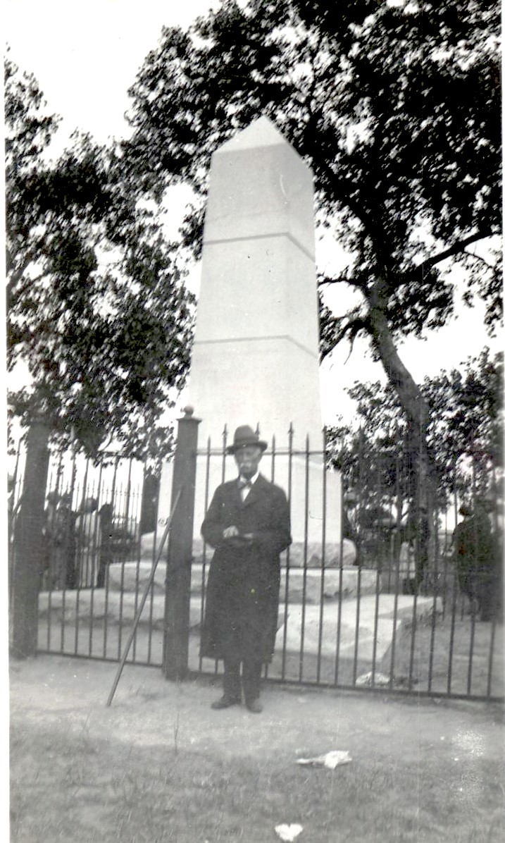 The photograph with the gentleman in front of the monument has a note on the back of the photo: The last scout living that came back to help and one of the youngest.