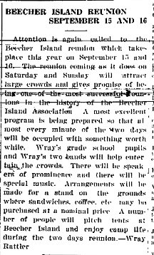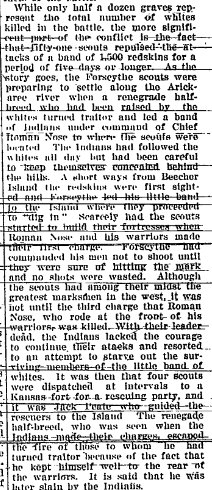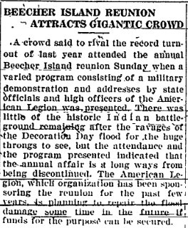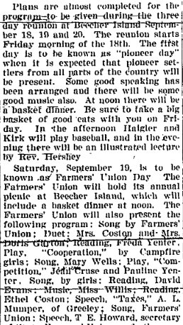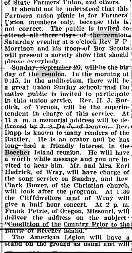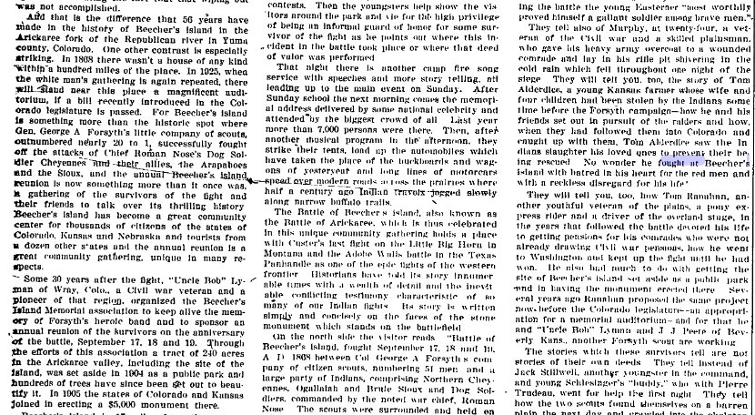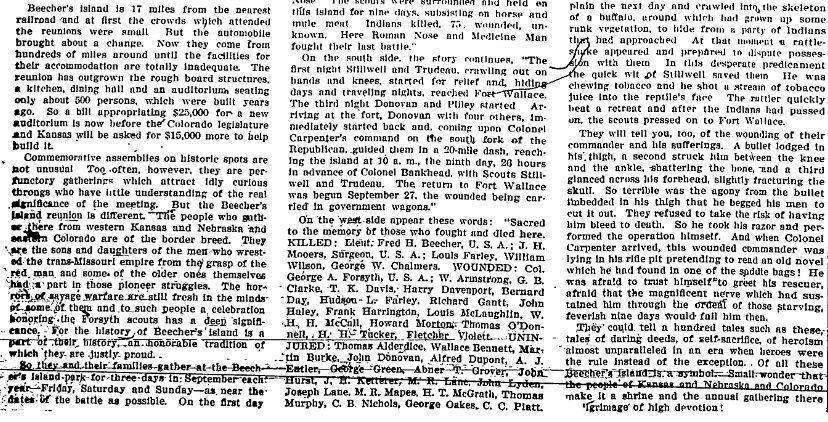 The Kirk neighborhood reporter commented "Quite a crowd attended the Beecher Island reunion, but as far as entertainment was concerned, it did not amount to much."
