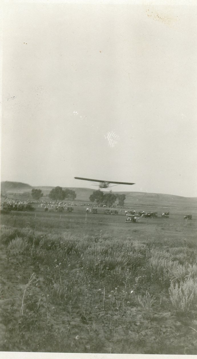 This photograph shows the 1905 monument and the tent meetings held until the Assocation constructed a building on the north bank of the Arikaree in the late 1920s.