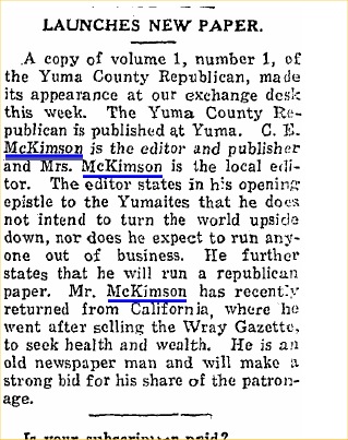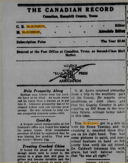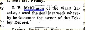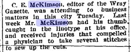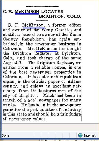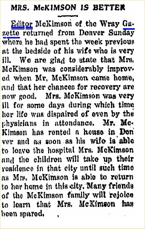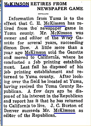 "Mr. and Mrs. C. E. McKimson, former publishers of The Gazette, spent Friday night of last week in Wray. They left Wray in 1921 and now publish a newspaper at Beloit, Kan."