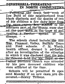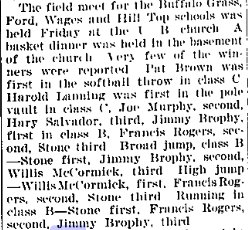 April 18, 1929 "In Miss Johnston's Hilltop school two pupils passed the eighth grade examinations, Ruby Northcut and Melvin Brady."