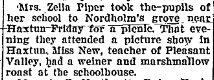 April 26, 1934 "Miss Edith New closed a very successful term of school at Pleasant Valley last Friday with a picnic dinner and weiner roast."
