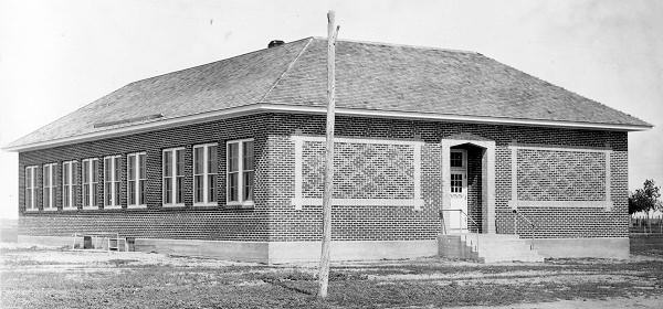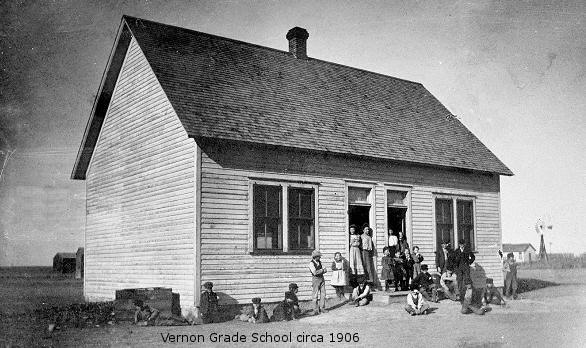The new town of Vernon didn't have a school in town until 1905 when the District 43 School Board voted to build a new two room school house in town to replace the 1887 Sunny Side school located 1½ miles west of town. "Block 9" in the original Vernon plat was purchased by the board for $7.99 at the County Treasurer's tax sale and $600 was spent on the building.