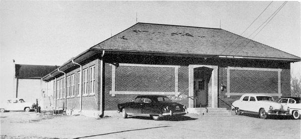 In 1949 funding to build a gymnasium, school kitchen and lunchroom, indoor restrooms, lockers and a school stage was approved. The gym and a two story cement block extension (half-flight up to the lunch room/kitchen and a half-flight down to restrooms, lockers and stage) was completed in time for the 1949-1950 school year. In the new gym west of the two-story extension, Vernon had the the first regulation basketball court in the league with the playing floor about three feet lower than the stage.