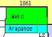 When Colorado Territory was created by Congress in 1861, northeastern Colorado was split between Weld and Arapahoe Counties along the 40th parallel. What is now Yuma County was split in half; Weld County to the north and Arapahoe County to the south. Both of the new counties stretched from Denver to the Kansas-Nebraska border. The land in eastern Colorado south of the Platte and north of the Arkansas remained mostly unoccupied. (The area covered by today's Yuma County is outlined in green.)