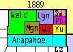 Two years later in 1889, Washington County was divided in half and Yuma County [shown in yellow] was created with the County seat in Yuma. The southern portion of today's Yuma County remained in Arapahoe County. In the same year, Logan County was divided in half to create Sedgwick [orange] and Phillips [violet] Counties. Morgan County [dark brown] was formed from the southeast corner of Weld County. Arapahoe County remained stretching from Denver to the Kansas border.