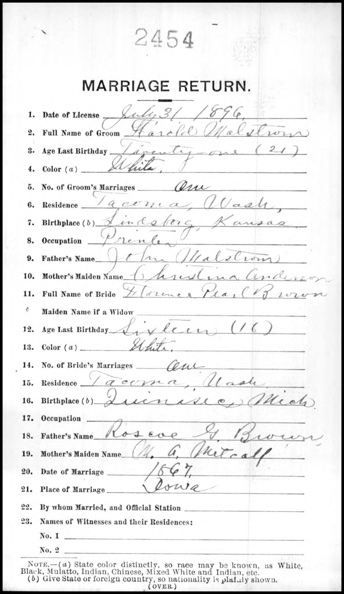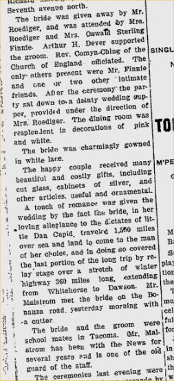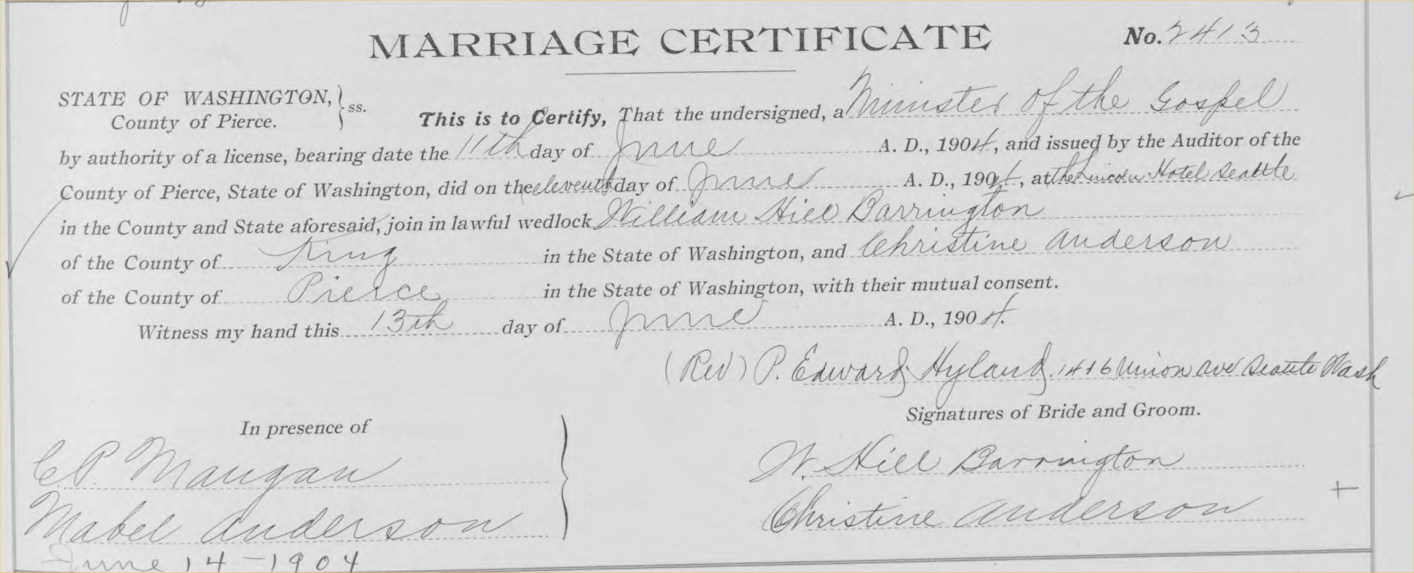 Witnesses were the minister's wife, Mrs. W.E. Pettigrew, and a Mrs. Frank Rowley