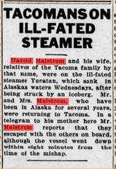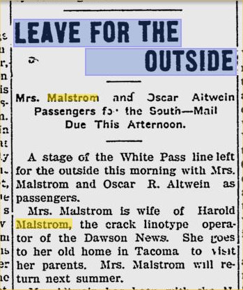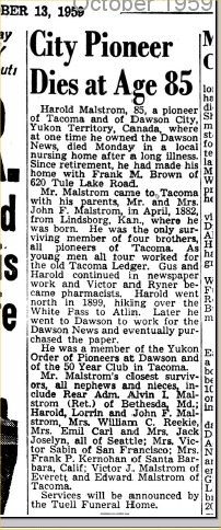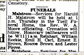 Harold H. Malmstrom (sic) is assistant mailing clerk at the Ledger. Riner F. Malmstrom is a mail wrapper there, and Victor H. Malmstrom is a mailing clerk. All three board at 1711 South G., where John F. Malsmstrom lives.