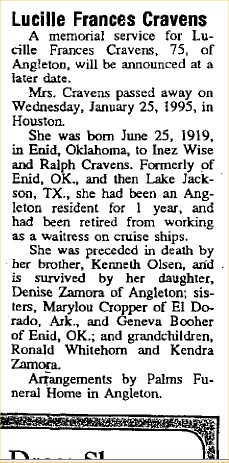 Lucille Frances Cravens - SSDI last residence Angleton, Brazoia County, Texas