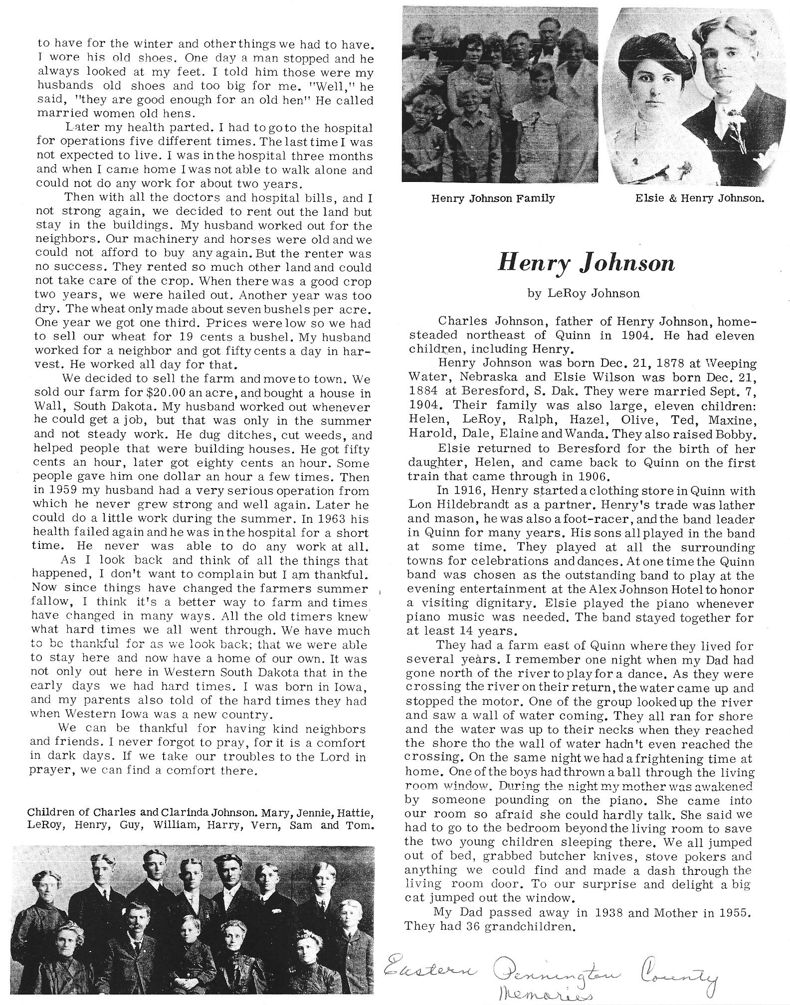 Descendants of Samuel M. Woodward (see photos at bottom of the page) Generation No. 1 1. SAMUEL M.8 WOODWARD (SAMUEL S.7, WILLIAM6, ABRAHAM5, WILLIAM4, RICHARD3, RICHARD2, EDWARD1) was born 12/15/1829 in Morgan County, Indiana1, and died 11/16/1886 in Dell Rapids, Dakota Territory2. He married (1) MARY HINSHAW3 2/07/1850 in Henry County, Iowa, daughter of WILLIAM HINSHAW and MATILDA DOANE. She was born 2/12/1833 in Tennessee4, and died 12/20/1860 in Hardin County, Iowa4. He married (2) EMMA ROSALIA BENBOW5 4/26/1866 in New Providence, Hardin County, Iowa6, daughter of CARVER BENBOW and LUCINDA RUBOTTOM. She was born 1/13/1842 in Park County, Indiana7, and died 7/04/1914 in White Lake, Aurora, South Dakota. Notes for SAMUEL M. WOODWARD: 5'9" tall, grey eyes, auburn hair, light complexion per enlistment papers. Have transcription of his diary courtesty Pat Engebretson (for a photo of the diary see Nadine's Civil War page and use the back button on your browser to return here. The diary starts September 15, 1862 at Eldora Hardin County, Iowa, and ends March 7, 1865 at Cairo, Illinois. February 28, 1865 mentions stopping by brother William A. Woodward's home at Newton, Iowa. Story of the Thirty Second Iowa Infantry Volunteers by John Scott, 1896, "We arrived at Vicksburg on the 6th, a number of the boys being completely worn out. The doctors believed it best to lease some of them at the hospital, but they thought it very hard to be thus left on the way home, and their comrades determined that it should not be. Samuel M. Woodward, of Co. F, was ordered to the hospital, but some of his comrades said, "No, he shan't be left; he shan't be left. He stood by us, and now we will stand by him." They hired an old darkey with a carriage, took him to the river and carried him on board the steamer Von Phul. Hardin County Probate Records - Book A, page 125 S. M. Woodward appointed guardian for minor children of Mary Woodward, deceased. Samuel petitioned the court to sell land belonging to said minors - undivided shares of NW/4 of Sec 23 & N part of SW/4 of NW/4 of Sec 23, T72N, R7W Curiously the 1880 census shows all children born Iowa except for Eora (Evangeline} age 6, born Dakota Territory - apparently they may have gone on the 1872 gold rush to South Dakota as did other Woodward descendants. And as other descendants did, returned disappointed to Iowa. 1860 census in Hardin County, Iowa as S. M. Woodworth. Abigail Shelley Woodward, his mother is with them, age 63. For more on the parents of Samuel M. Woodward see Nadine's page on Sam and Abby Woodward and use the back button on your browser to return here or click on the Samuel M. Woodward link on that page. More About SAMUEL M. WOODWARD: Burial: Zion Cemetery, Beresford, South Dakota Military service: 8/15/1862, Civil War, Co F, 32nd Regiment of Iowa Volunteers Occupation: 1850, Farmer Will: 10/08/1859, Named as Executor of his father's will8 Notes for MARY HINSHAW: Mary died shortly after the birth of Mary, Jr., and the children were parceled out to various family members. Abigail took care of some of the children while Samuel served in the Civil War. A William Hinshaw signed as witness to the will of Samuel S. Woodward - no doubt Mary's father as he was in Hardin County, Iowa. Note: Mary was aunt of William Wade Hinshaw. For more on Mary's family see the William Hinshaw page and use the back button on your browser to return here. More About MARY HINSHAW: Burial: Honey Creek Cemetery, Providence Twp, Hardin Co, Ia More About SAMUEL WOODWARD and MARY HINSHAW: Marriage: 2/07/1850, Henry County, Iowa More About EMMA ROSALIA BENBOW: Burial: White Lake Cemetery, Aurora County, South Dakota Religion: Quaker More About SAMUEL WOODWARD and EMMA BENBOW: Marriage: 4/26/1866, New Providence, Hardin County, Iowa9 Children of SAMUEL WOODWARD and MARY HINSHAW are: i. IRA9 WOODWARD, b. 3/01/185110; d. Bef. 1860, Infancy. 2. ii. WILLIAM HENRY WOODWARD, b. 1/03/1852, Iowa; d. 8/03/1928, Aurora County, South Dakota. iii. CLARINDA J. WOODWARD11, b. 1/31/1854, Iowa12; d. 3/01/1927, Iowa; m. CHARLES JOHNSON. Notes for CLARINDA J. WOODWARD: In 1877 Clarinda and Charles are in Cass County, Nebraska, Plattsmouth city. Charles is a farmer, and they have four children. In 1880 Clarinda, married to Charles Johnson, is in Avoca, Cass County. Nebraska. Charles is 31, stonemason, born in Illinois, father in New York SO HE IS SON OF HOLLIS JOHNSON, whose daughter married Clarinda's cousin William RIley Woodward. Children are Mary, 8, born Iowa, Jenny 7, Iowa , Hattie, 5, Dakota Terr, Leroy 3 and Henry 1 were born in Nebraska. They moved to South Dakota in 1881, if the "24 years in state" record in the 1905 census is correct. In 1883 they are in Lincoln County, Dakota Territory (souty Dakota), where Ira William Johnson birth on March 16. His father is Charles Henry Johnson, mother Clarinda Jane Woodward. In 1900 they are at Beresford, Union County, S.D. with Leroy w., Oct 1876 is a stonemason, Henry W. Sept 1878 is a lather, Guy W Oct 1881 and Ira W. Mar 1883 are laborers, Harry H. July 1888, Charles U. May 1890 and Samuel S. Aug 1894 are in school, and Thomas B Sep 1897 is at home. In 1910 Peno, Pennington County Charles is still a stonemason /bricklayer, with Samuel - a farm laborer at 16, and Thomas the only children. He likely is the Charles H. Johnson granted a homestead claim March 15, 1915 for the northeast quarter of section 29, 2North 17East in Pennington County. The South Dakota death index has Charles J. Johnson dying June 6, 1923 in Pennington County. In the 1925 state census Clarinda is widowed, and said she was a Methodist.