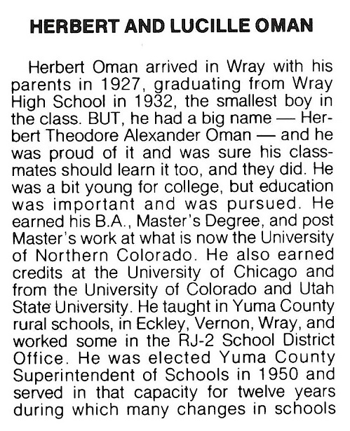 of Wray and Mrs. Jennie Monk of Yuma; their son, Herbert Oman of Wray; a brother,