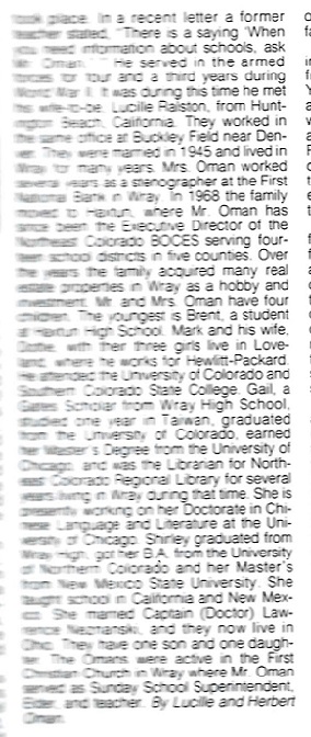January 1946 "Mr. and Mrs. Herbert Oman and Shirley Kay returned Wednesday from a two weeks'