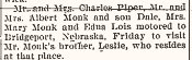 August 1950 "Seventy relatives from Colorado, Wyoming and Nebraska were in attendance at the annual Monk family reunion which was held on Sunday in the Elks park at McCook. Those going from this community were the Doyle Neiman. Dale and Bert Monk, Charles Piper and Carroll Josh families and Mrs. Anna Monk. Grandmother Mary Monk of Newark, Nebraska, returned home with the Colorado relatives."