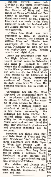 " Mrs. Mary Monk and son Leslie, accompanied by the three children of the latter and a niece, Miss Velma White, all of Kearney, Co., Neb., have been visiting at the Albert Monk home the past week. Mrs. Monk and Leslie are mother and brother of Mrs. Albert Monk. During their stay they visited other relatives and friends in Yuma County.