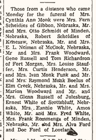 Seventy relatives from Colorado, Wyoming and Nebraska were in attendance at the annual Monk family reunion which was held on Sunday in the Elks park at McCook. Those going from this community were the Doyle Neiman. Dale and Bert Monk, Charles Piper and Carrol Josh families and Mrs. Anna Monk. Grandmother Mary Monk of Newark, Nebr., returned home with the Colorado relatives.