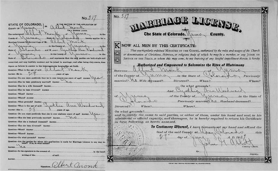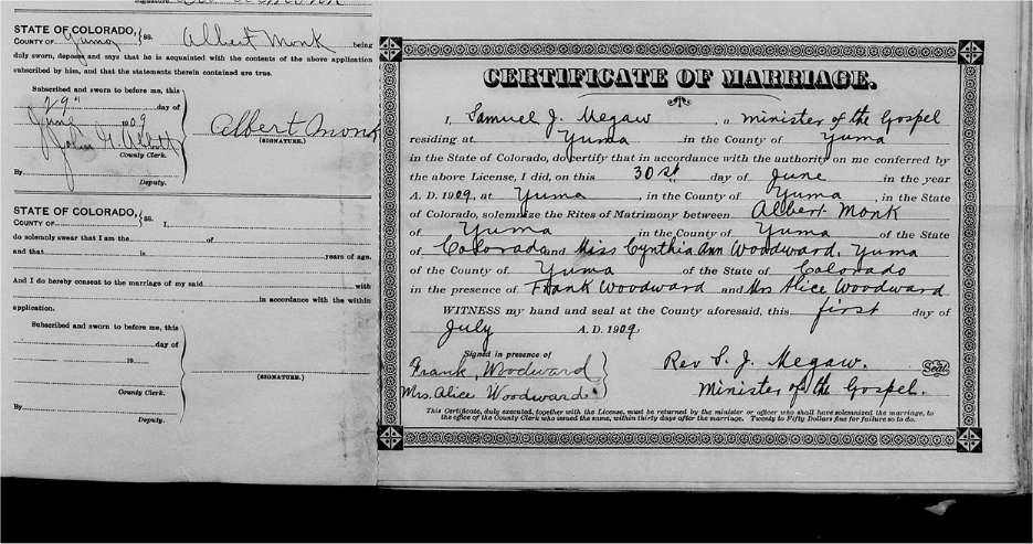 One of the witnesses was Albert Monk, age 23, son of George P. and Mary Sides Monk.