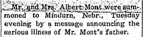 September 29, 1916 Albert Monk and family, of northeast of Yuma, were summoned to Minden, Nebraska Sunday night by a message stating that Mr. Monks father, who has been sick for some time, was much worse.