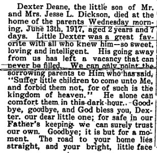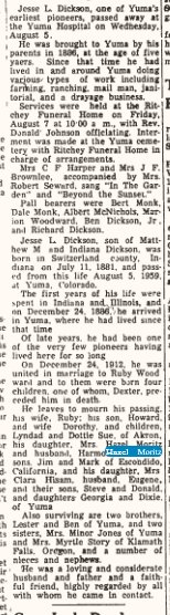 The following story was given to me by Ben Dickson. Jess Dickson, who told the story was Ben's uncle and the father of Clara Hisam [Mrs. Eugene Hisam]. Jess, born in July of 1881, was the oldest of five children. His father, Matthew Dickson, was born and grew up in New Jersey. Matthew's father, a Union Soldier, was killed in the Civil War, so Matt, his brother and two sisters were raised by their mother. Matt met and fell in love with a young lady by the name of Indiana Harmon. Indiana's father, a Confederate soldier, was also killed in the Civil War. Matt and Indiana were married in Switzerland County, Indiana and later moved to Illinois where two of their children, Jess and Myrtle, were born. Matt came to eastern Colorado on Christmas Eve 1886 and filed a pre-emption claim on land seven miles northeast of Yuma. [This was about half-way to the land where Ruby's older brother Francis (Frank) Woodward and older sister Cynthia Ann Woodward filed] Three more children, Maude, Lester, and Benjamin, were born in Colorado. According to a granddaughter, Indiana's family did not want her to move to Colorado. They thought it was nothing but a wilderness with Indians. When she came here anyway they never wrote to her or contacted her again. As a young man, Jess worked as a cowboy and ranch hand. After his marriage to Ruby Woodward he ran a dray business. That meant he met the train with his team and wagon and hauled the sample cases, etc. of the drummers (salesmen) to the various stores so they could show their wares. He also unloaded flour, sugar and other groceries that arrived on the train and hauled them to the stores or where ever they needed to go. When trucks were invented and came into the area, he quit the dray business and worked at the Red and White store and later for Mustains. [both were grocery stores - Mustain's still in business in Yuma] Jess was one of the first firemen and was a charter member of the Yuma Volunteer Fire Department. He and Ruby were the parents of four children, Dexter, (who died as an infant), Howard, Hazel and Clara. [in the 1950's Jess and Ruby worked at a creamery on Railroad Street just east of Main. They lived on North Main, on the east side directly across from the fairground road]
