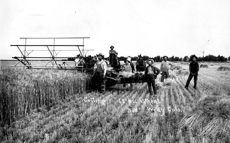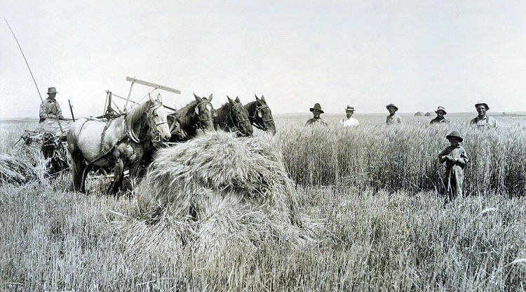 This photograph shows W.B. Coston's horse drawn binder cutting Joe Keenan's 40 bu/acre wheat about 1905. That is W.B. on the binder.