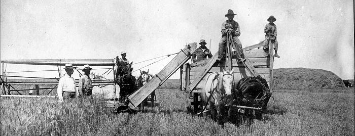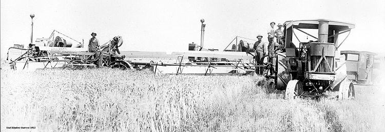 We end early wheat cutting photographs from the Coston Collection with a photograph of James A. Kimber's 1922 harvest crew using two of the early tractor pulled "combines".