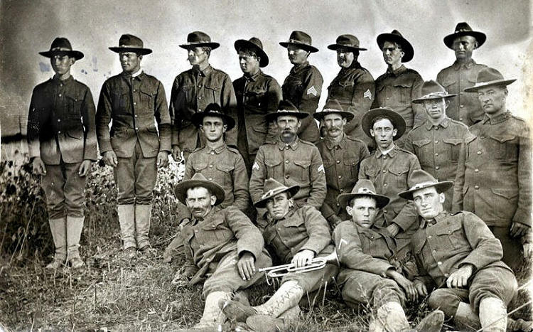 Dallas didn't know much about this photograph except that Albert and George Riedesel were members of a local unit until required unit drill time kept them from doing their work on the farm. Albert and George appear to be the two privates in the center of the back row. Jerry Wilcoxen has identified the private laying front right as Thomas "Bud" Fox and suggested the bugler was probably Eads Lehman.