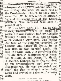 John's daughter Mary Elizabeth Martin married Clifford Whittenburg, lived in Yuma County, buried in Wheat Ridge, Colorado 1878-1964.