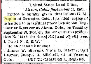 In 1893 Yuma County Robert G. M. Poplin proved up 160 acres in sections 3 and 4, 1N 45W, and timber-claimed another quarter in 1901.