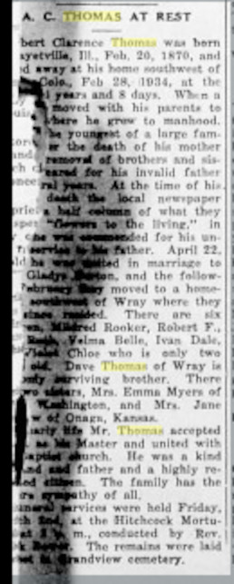 Cecil Rooker, 78, Stockton, died Saturday, July 4, 1987 at his home. Mr. Rooker was born March 4, 1909, at Glen Elder. He had been a resident of Stockton since 1957, moving from Russell. He was a laborer at farms, lumber yards and oilfields. He was a veteran of World War II. He was a member of the American Legion of Russell and Stockton. Survivors include his wife, Mildred of the home; three sons, Fred of Stockton, Robert of Denver and Lester "Boyd" of Norfolk, Va.; three daughters, Betty Young of Wichita, and Fern Mattheyer and Dorothy James, both of WaKeeney; two brothers, Wayne of Republic and Orva of Hunter; a sister, Elizabeth Sackhoff of Colorado Springs, Colo.; 16 grandchildren; and 15 great- grandchildren. The funeral will be 1:30 p.m. Monday at the Smith-Moore Funeral Home, Stockton, the Rev. Mel Shepherd officiating. A service will be 4 p.m. Monday at the Athens Cemetery, Ionia. Visitation is at the funeral home until service time. Cecil is buried in Jewell County, Kansas # 40304266. So is Mildred Ann Rooker 1911-1991 # 40304270 Mildred Ann Rooker, 80, WaKeeney, died Saturday, March 16, 1991, at the Trego County Lemke Memorial Hospital, WaKeeney. Mrs. Rooker was born Mildred Ann Thomas on Feb. 16, 1911, at Wray, Colo., and had been a WaKeeney resident for years, moving from Stockton. She was a homemaker and attended the Christian Church in Stockton and Ogallah. Her husband, Cecil P., died in 1987. Survivors include three sons, Fred of Stockton, Robert of Denver and Boyd of Virginia Beach, Va.; three daughters, Betty Young of Wichita and Fern Mattheyer and-Dorothy James, both of WaKeeney; three sisters, May Stevens of Denver, Velma Gordan of Douglas, Wyo., and Violet Carriker of Port Ortord, Ore.; 15 grandchildren; 16 great-grandchildren; and two great-great-grandchildren. The funeral will be at 11 a.m. today at the Ogallah Christian Church, the Rev. Wayne L. Lofton officiating. Burial will be at 3:30 p.m. today at Athens Cemetery, Ionia. Memorials may be made to the Trego County Hospital Memorial Fund. The Morell Funeral Home, WaKeeney, is in charge of arrangements. "Albert married Gladys Irene Jane BURTON on 22 Apr 1909 in Westmoreland, KS. Gladys was born on 6 Aug 1891 in Chicago, Cook Co., IL, died on 25 Feb 1974 in El Cajon Valley, CA, at age 82, and was buried in Greenwood Memorial Park, San Diego, CA." |